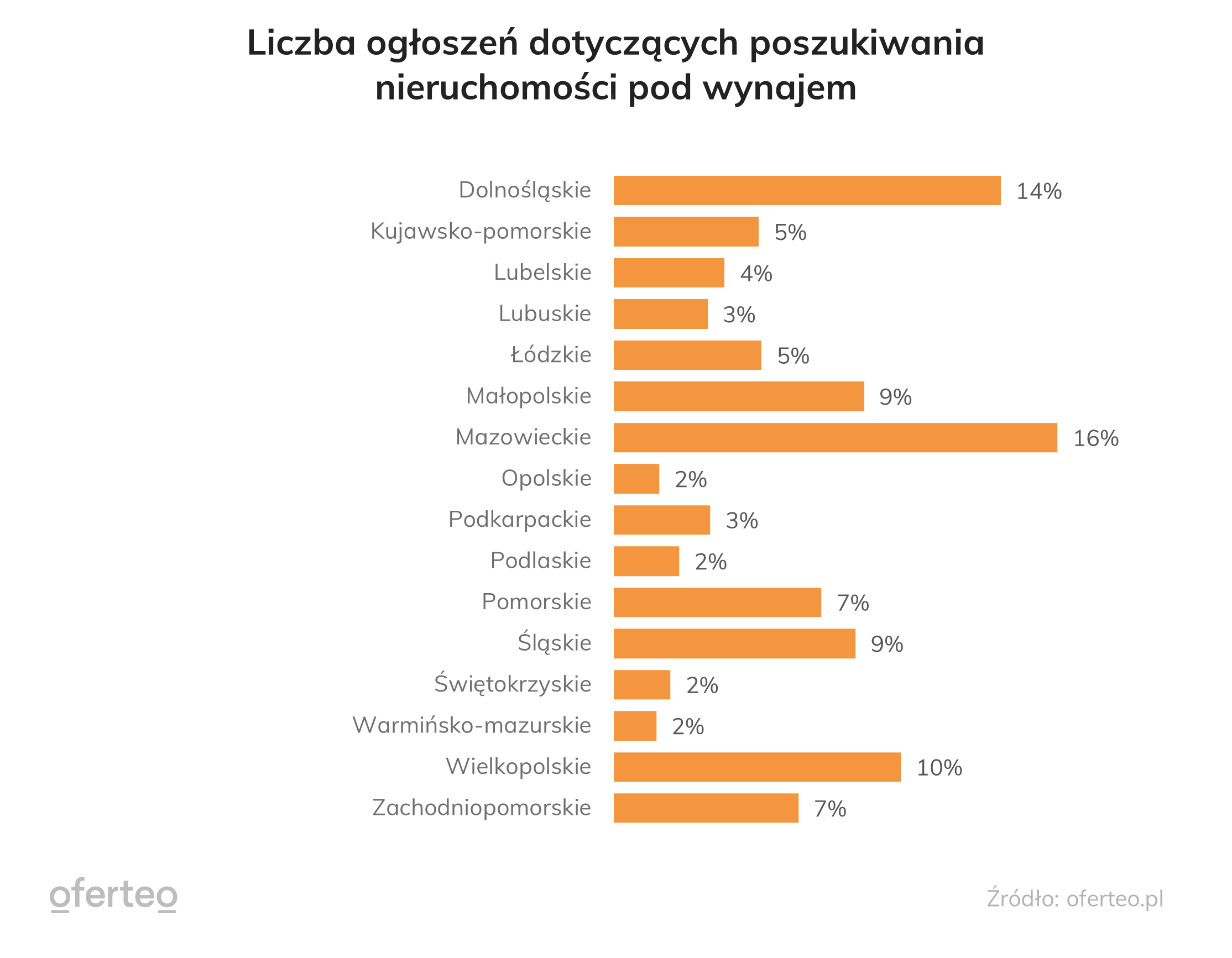 Nieco inną sytuację można było zaobserwować w przypadku zapytań dotyczących wynajmu, które zostały wysłane przez osoby szukające nieruchomości (najemców). Najwyższy odsetek odnotowano w województwach mazowieckim (16%) i dolnośląskim (14%). Najrzadziej zapytania dotyczące wynajmu pochodziły z województw: opolskiego (2%), podlaskiego (2%), świętokrzyskiego (2%) oraz warmińsko-mazurskiego (2%).