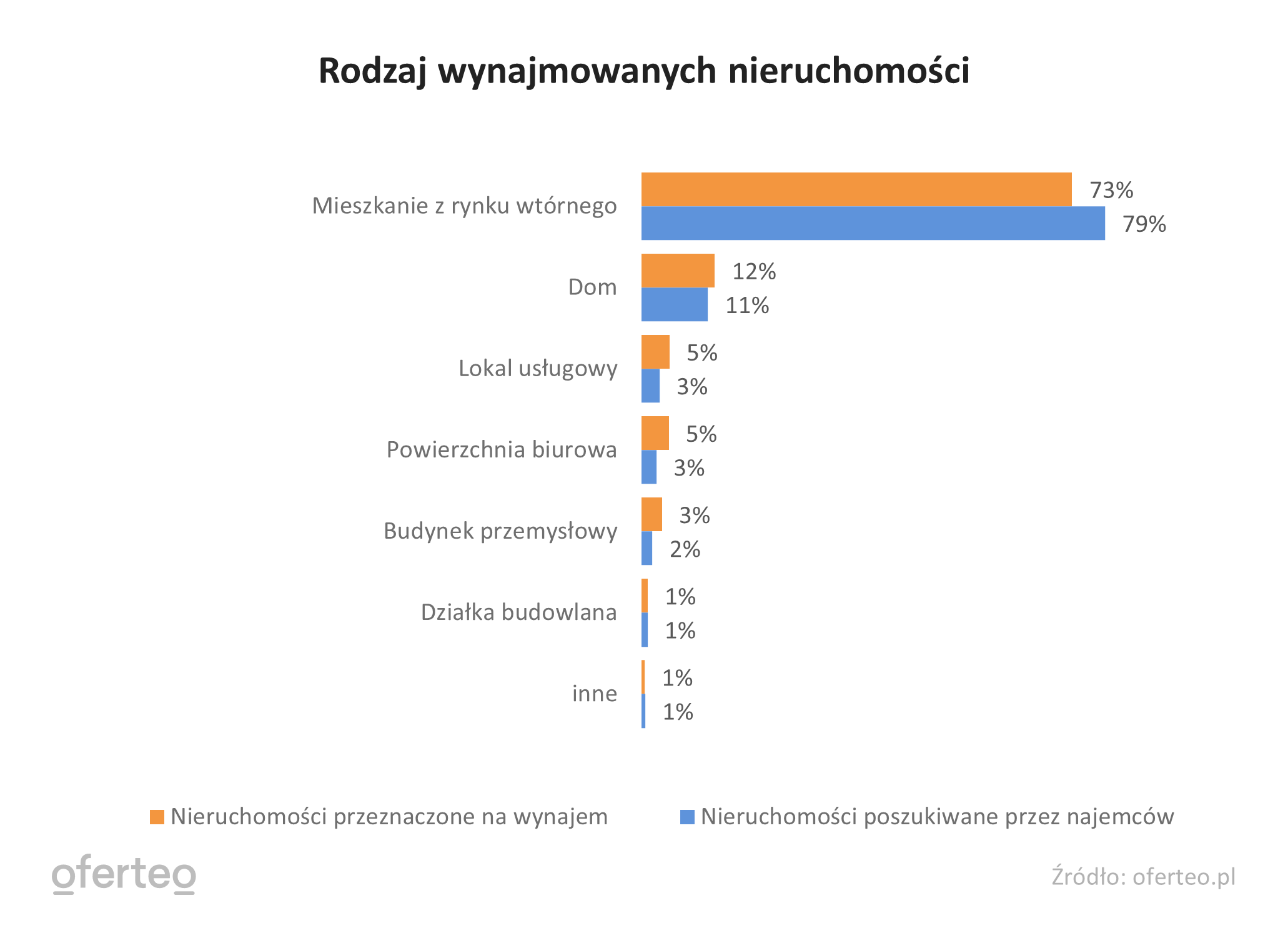 Mieszkania były nieruchomościami najczęściej udostępnianymi pod wynajem. Stanowiły one 73% ze wszystkich ofert tego typu – wynika z danych pochodzących z Oferteo.pl, największego polskiego serwisu łączącego poszukujących usług z ich wykonawcami. Następne w kolejności były domy (12%), lokale handlowo-usługowe (5%) oraz powierzchnie biurowe (5%). Rzadziej wynajmowane były budynki przemysłowe (3%) i działki budowlane (1%).