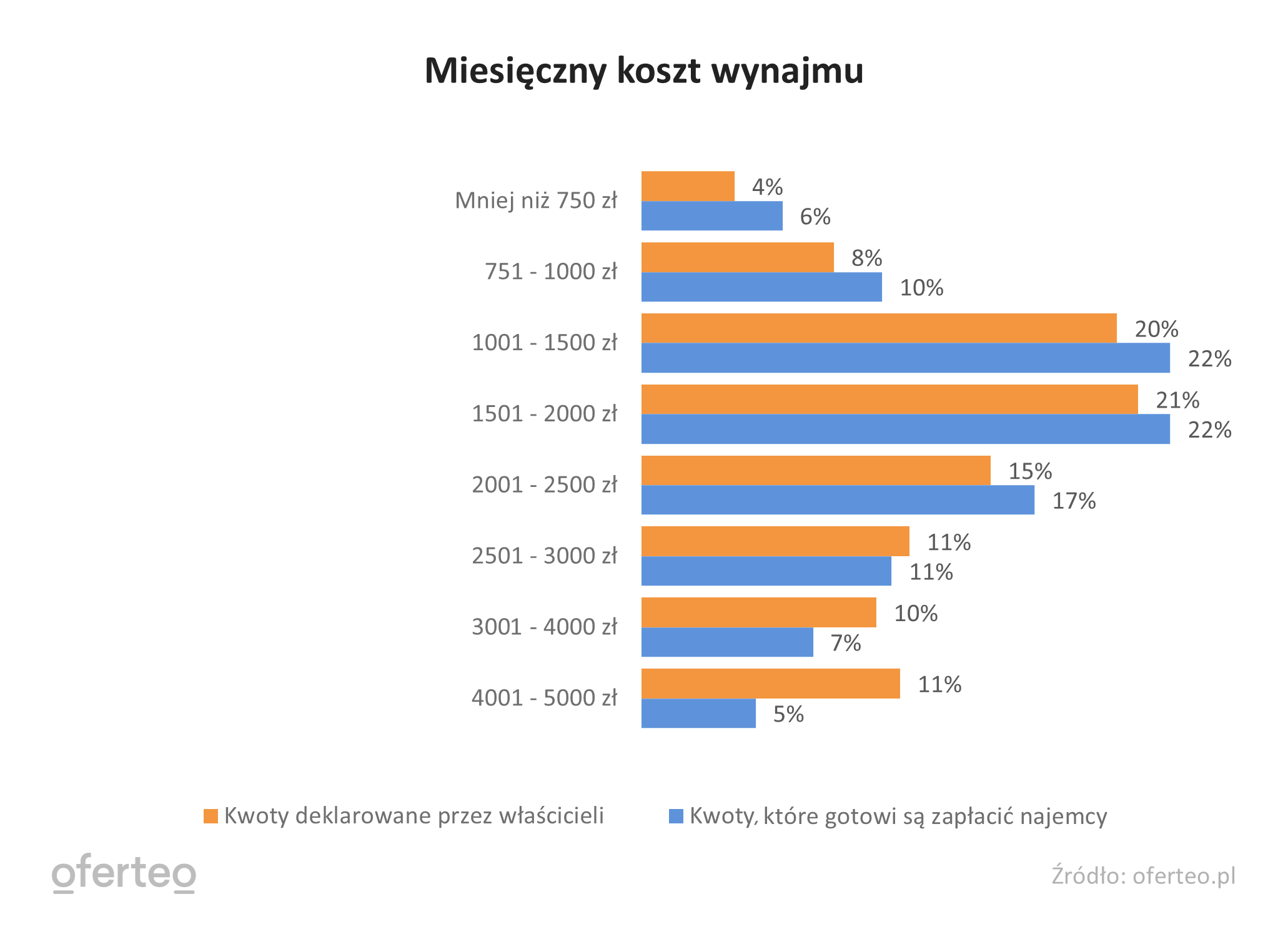 Analiza objęła również kwoty deklarowane przez właścicieli obiektów oraz preferowany koszt, jaki gotowi byliby zapłacić najemcy. W obu tych przypadkach wartości nie odbiegały znacząco od siebie. Najczęściej deklarowanymi przedziałami było od 1001 do 1500 zł oraz od 1501 do 2000 zł.