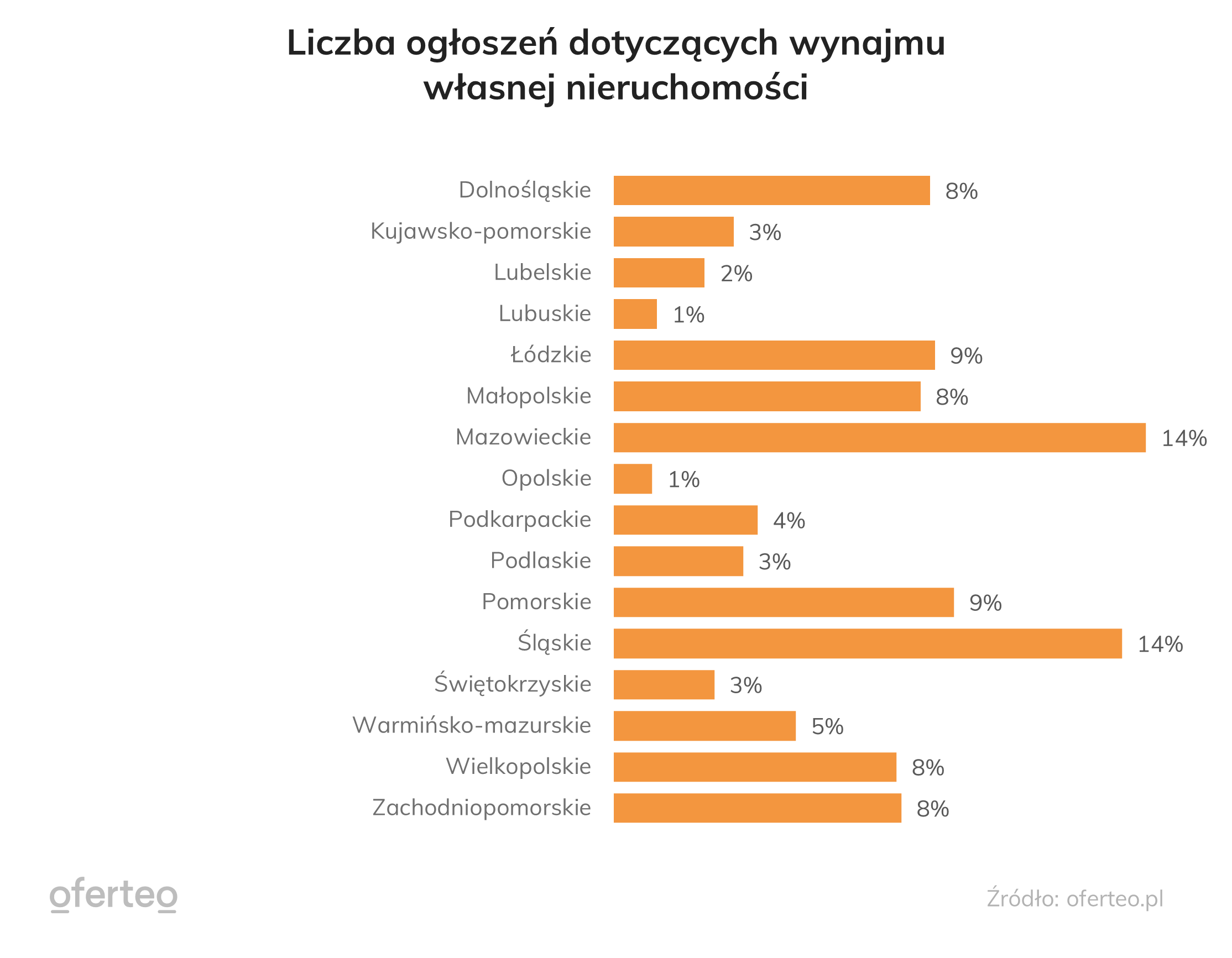 Dostępność nieruchomości na wynajem różni się w zależności od województwa. Najwięcej ofert przesłanych przez właścicieli (wynajmujących) odnotowano w województwie mazowieckim i śląskim. Stanowiło to odpowiednio po 14% ze wszystkich zapytań tego typu. Najniższy odsetek odnotowano natomiast w województwach lubuskim (1%), opolskim (1%) oraz lubelskim (2%).