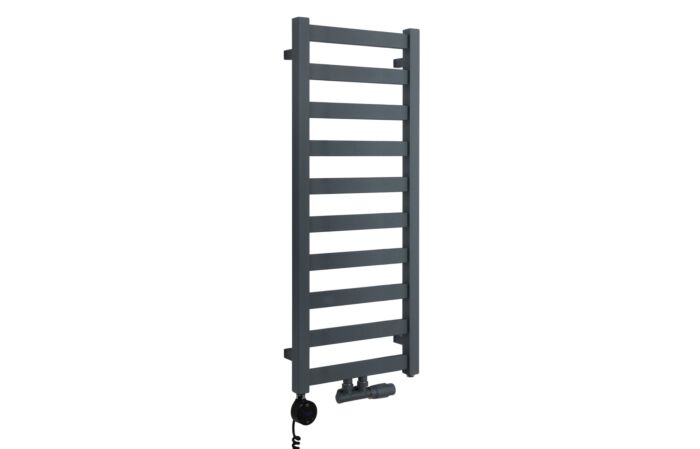 Grzejnik łazienkowy o nowoczesnym kształcie zbudowany z pionowych profili o kwadratowym przekroju i płaskich prostokątnych listew poziomych. Doskonale wkomponuje się we wnętrza współczesnych łazienek. Wersja w kolorze grafitowym o wymiarach 97x40cm i mocy 360W z podłączeniem dolnym środkowym.