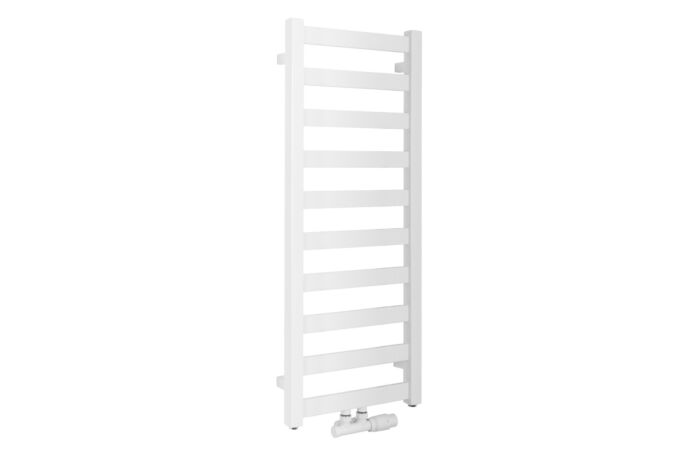 Grzejnik łazienkowy o nowoczesnym kształcie zbudowany z pionowych profili o kwadratowym przekroju i płaskich prostokątnych listew poziomych. Doskonale wkomponuje się we wnętrza współczesnych łazienek. Wersja w kolorze białym o wymiarach 97x40cm i mocy 360W z podłączeniem dolnym środkowym.