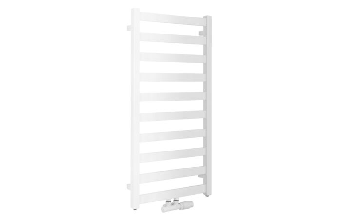Grzejnik łazienkowy o nowoczesnym kształcie zbudowany z pionowych profili o kwadratowym przekroju i płaskich prostokątnych listew poziomych.