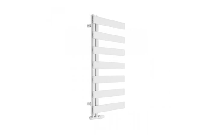 Nowoczesny grzejnik łazienkowy o zbudowany z prostokątnych listew. Asymetryczne usytuowanie pionowych kolektorów grzejnika nadaje mu dekoracyjnego charakteru, a jednocześnie pozwala na łatwiejsze przewieszanie ręczników. Grzejnik w kolorze białym idealny do małej łazienki.