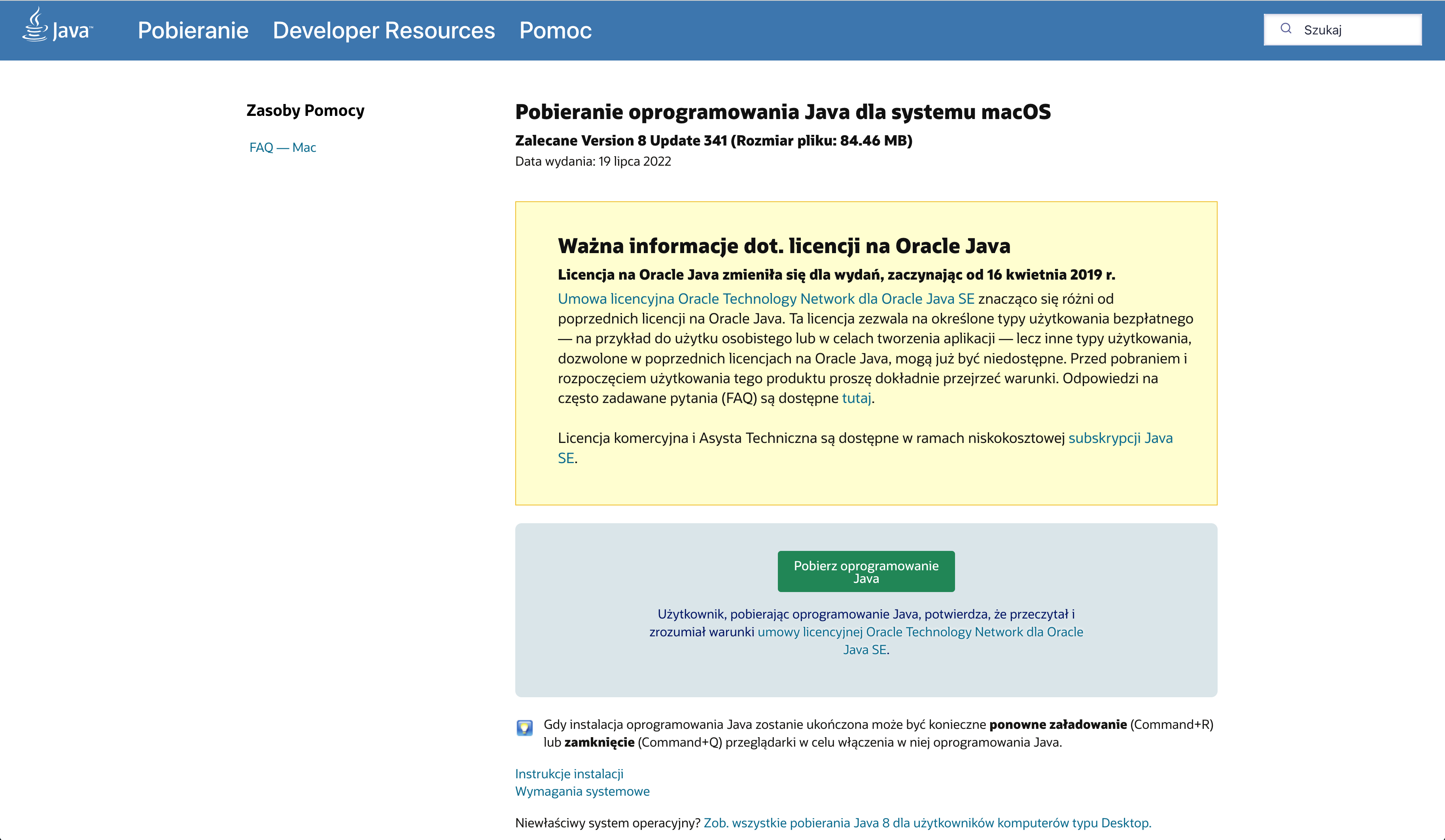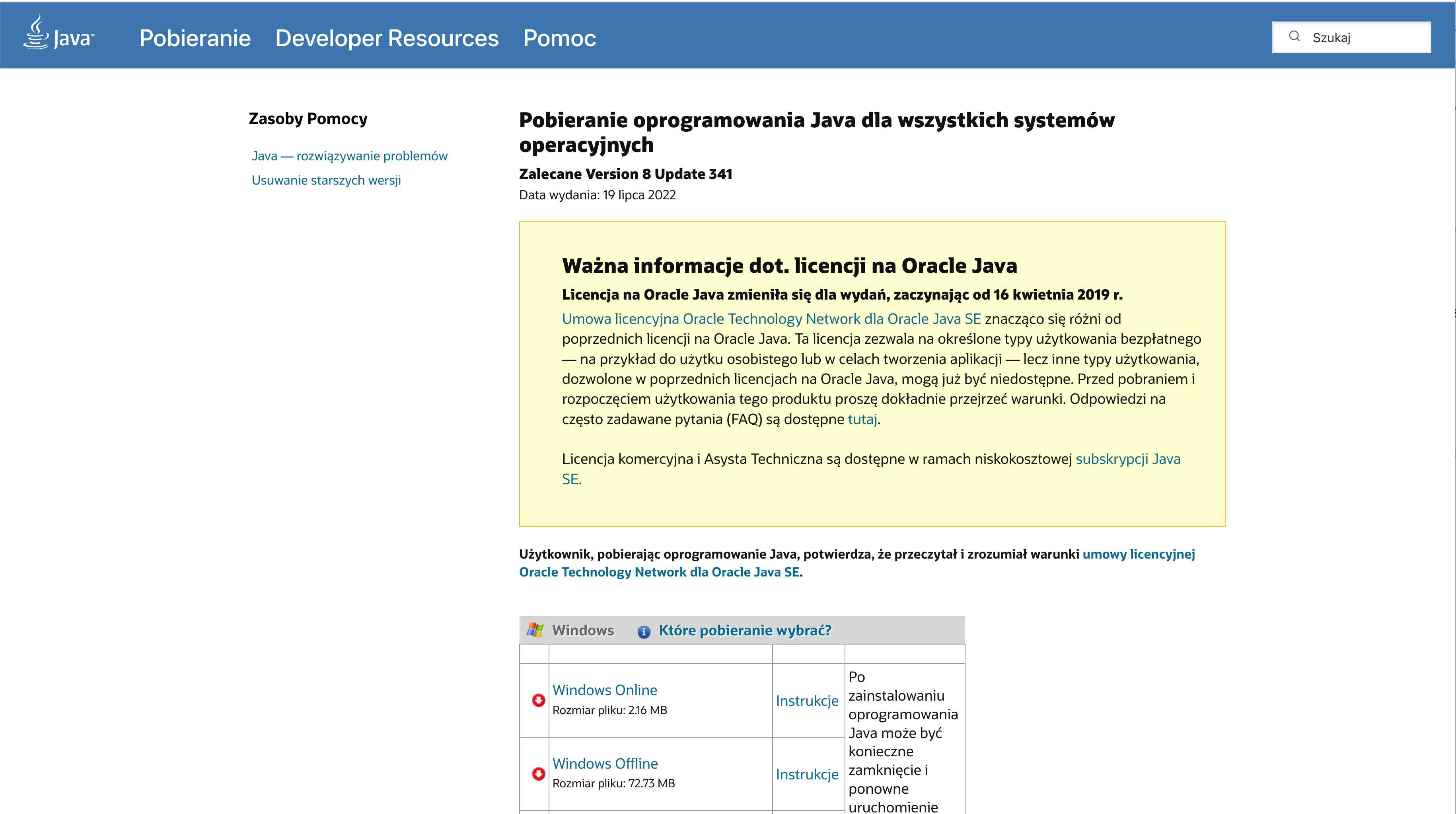 Pobieranie JAVA dla systemu operacyjnego Windows